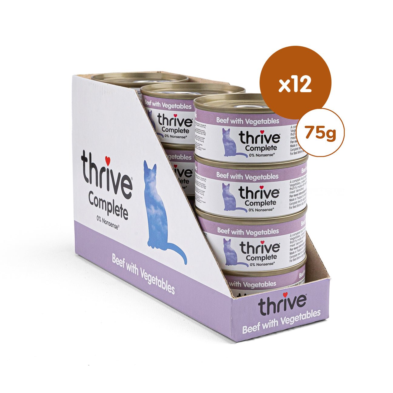 Made with beef as the only source of protein. Thrive Beef with Vegetables wet cat food is cooked in its own juices with added vitamins and minerals to give your cat a complete nutritionally balanced meal. This food is complete. which means it can be fed on its own or with our Thrive PremiumPlus dry food. depending on your cat’s preference.