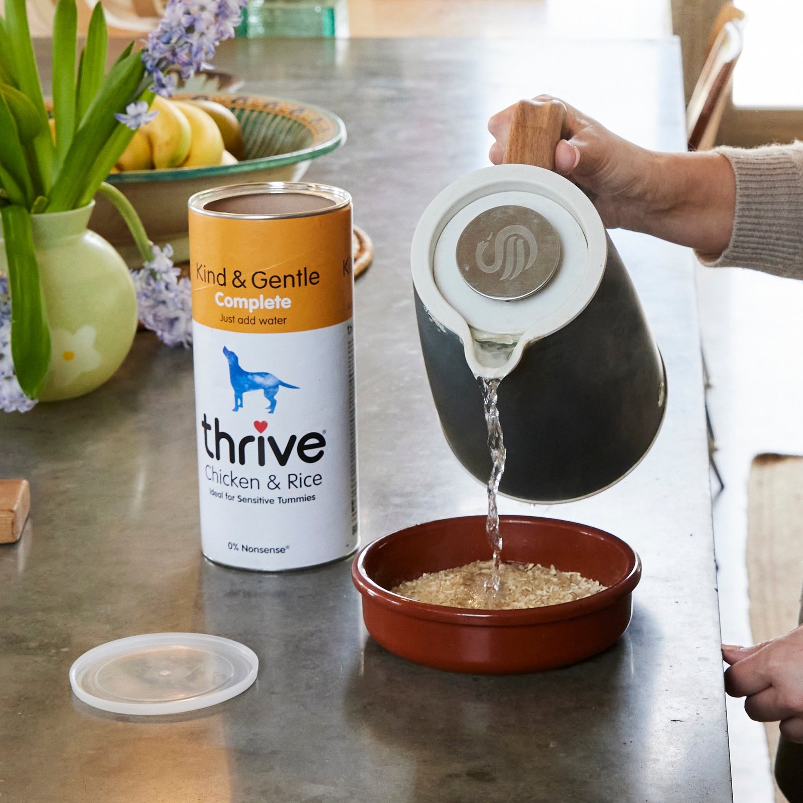 Thrive Kind and Gentle Chicken and Rice is a convenient 800g pack that makes the equivalent of 8 x 400g cans of dog food by simply adding water! This food is made from Italian rice and chicken breast. supplemented with dried algal oil. rich in marine algae and omega-3 fatty acids. along with all the necessary vitamins and minerals for your dog to flourish. Whether your dog has a sensitive stomach or just has fussy preferences. this food is the perfect option for them to enjoy a delicious and nutritious meal.